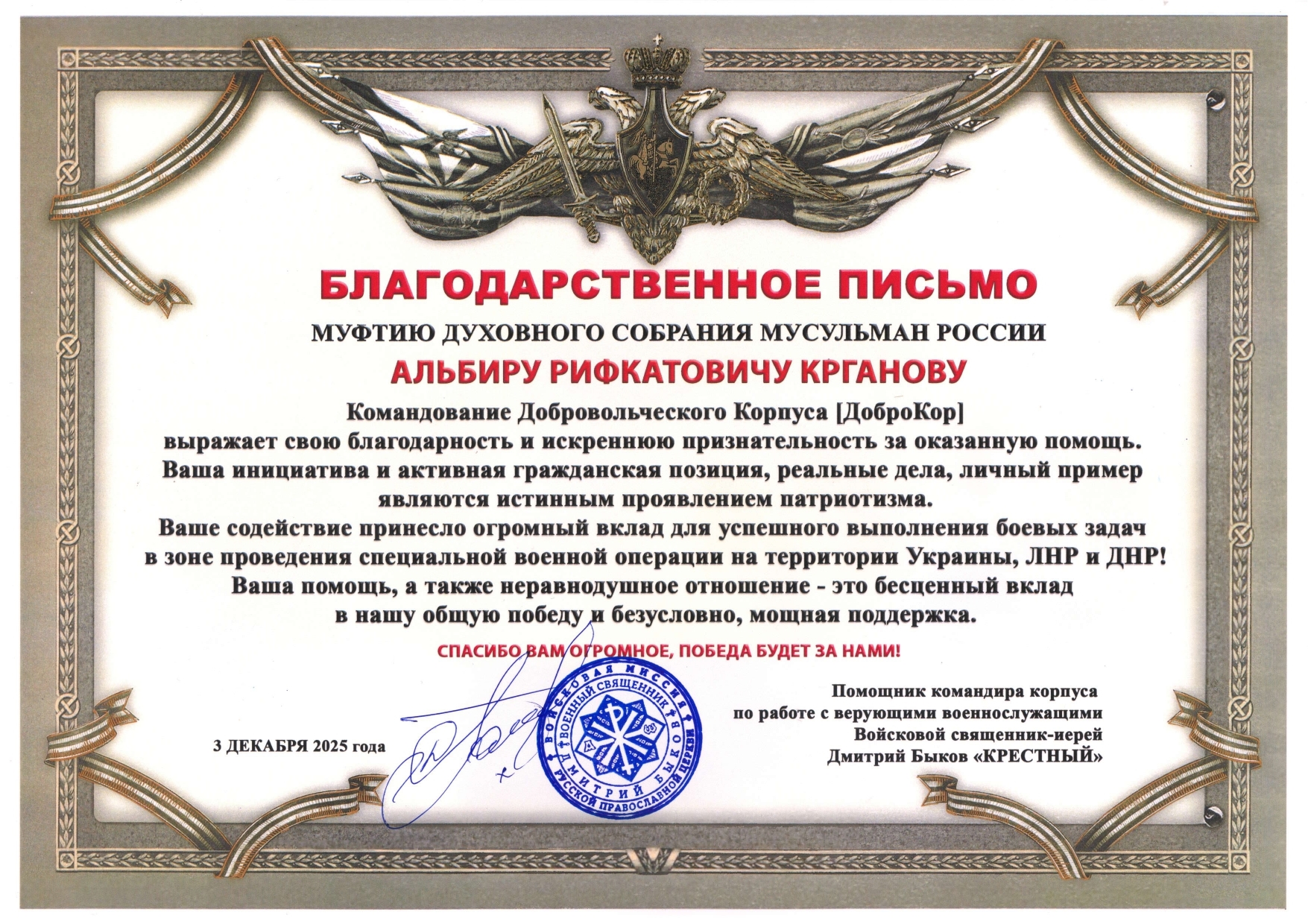 На имя муфтия Духовного собрания мусульман России Альбира хазрата Крганова поступило Благодарственное письмо от имени помощника командира корпуса по работе с верующими военнослужащими, войскового священника-иерея Дмитрия Быкова и командования Добровольческого корпуса (ДоброКор) со словами благодарности и искренней признательности за оказанную помощь, инициативу и активную гражданскую позицию, истинное проявление патриотизма, реальные дела и личный пример члена общественной палаты являются истинным проявлением патриотизма.