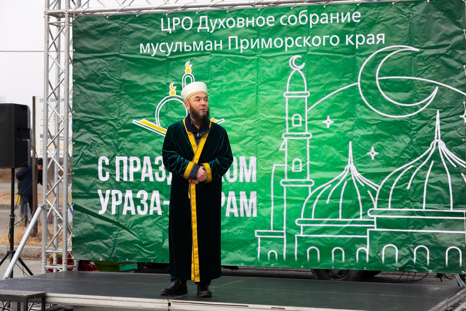 Перед намазом имам произнес праздничную проповедь, в которой напомнил верующим о значении этого дня. Председатель духовного собрания мусульман Приморского края в составе ДСМР Рамиль Кильмухаметов в своей речи подчеркнул важность единства и пройденного испытания постом.