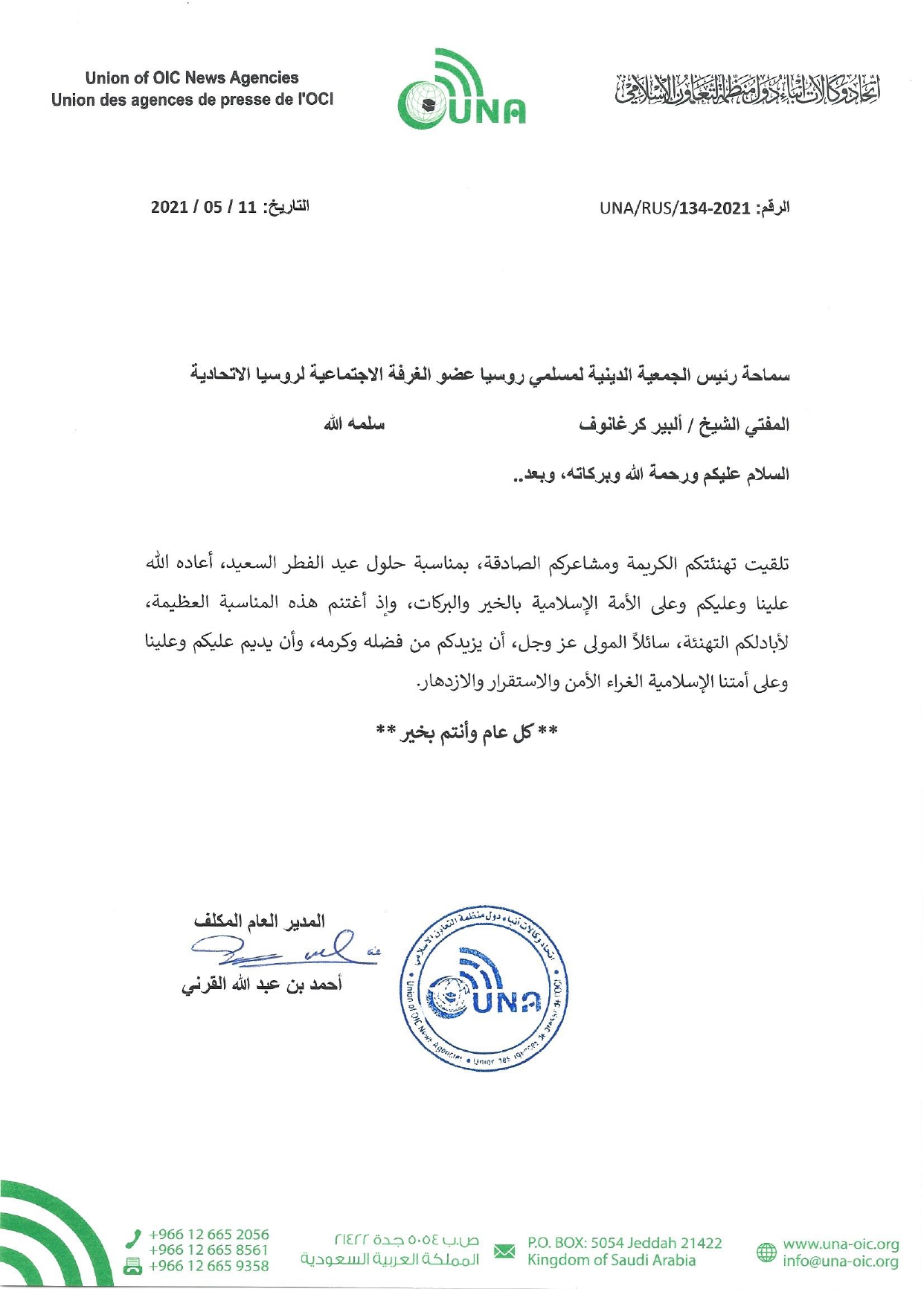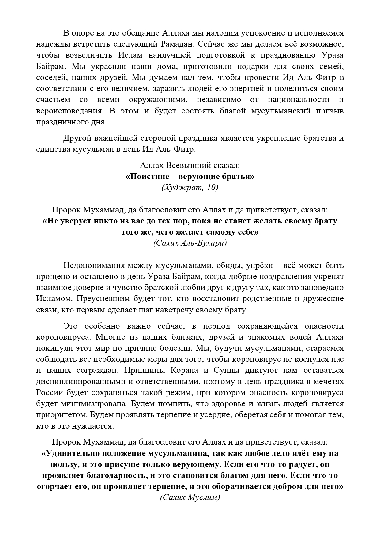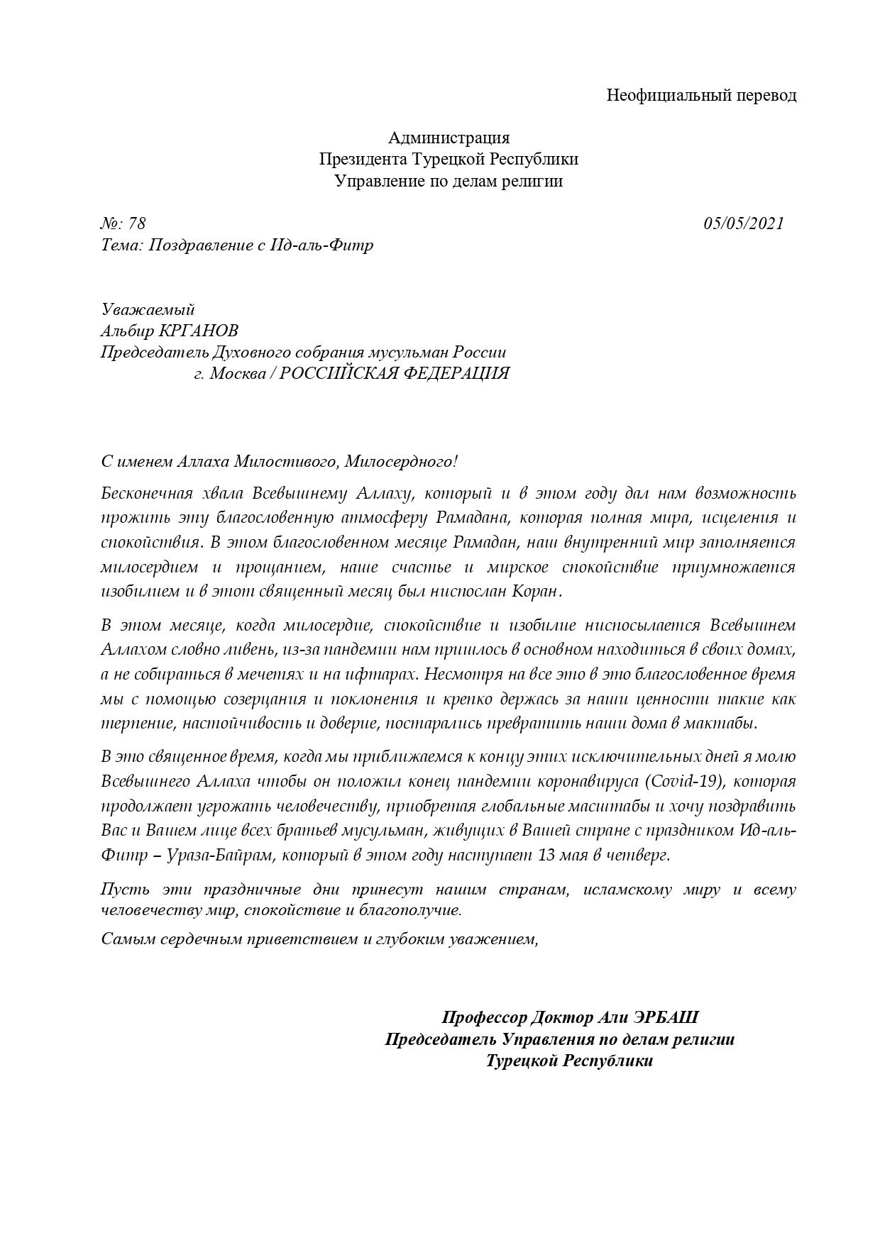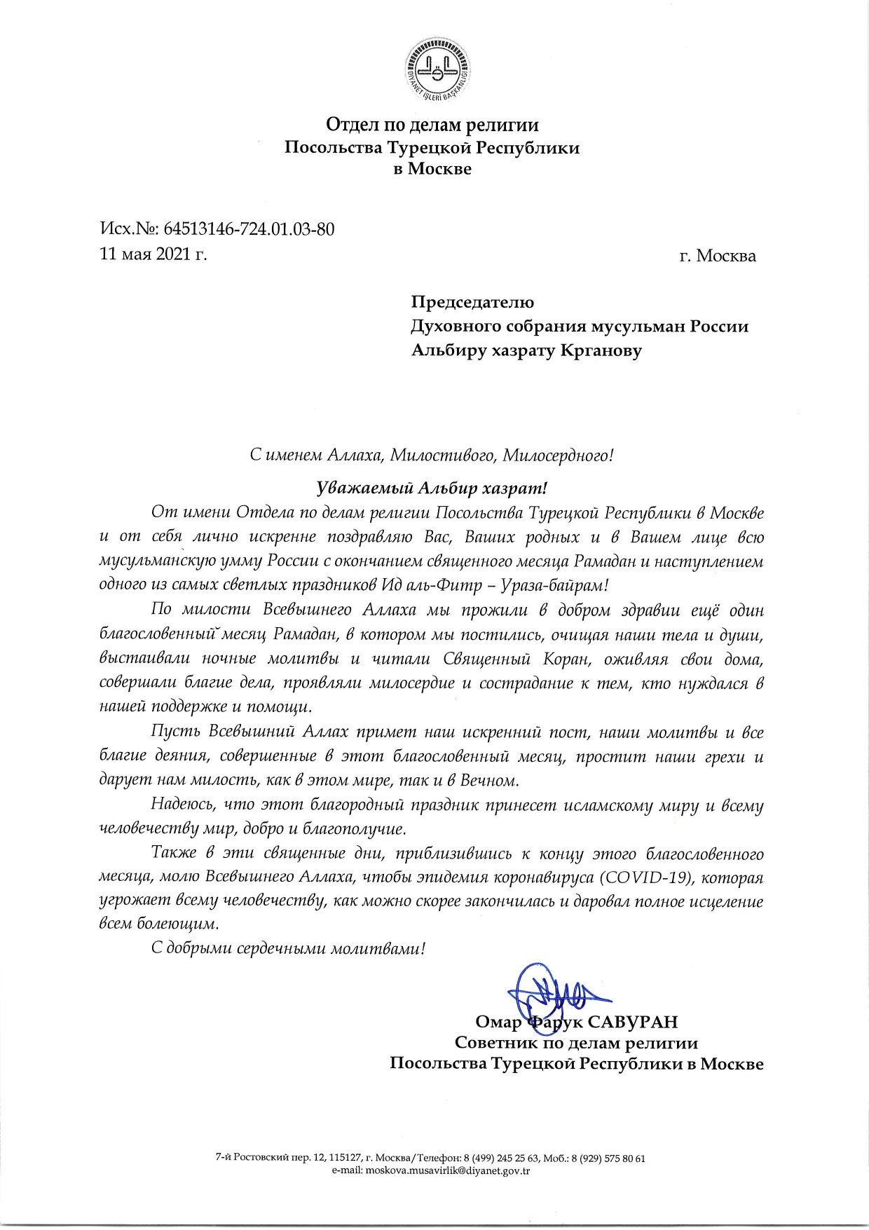В адрес Духовного собрания мусульман России поступили многочисленные поздравления по случаю празднования Ураза-Байрам 2021.