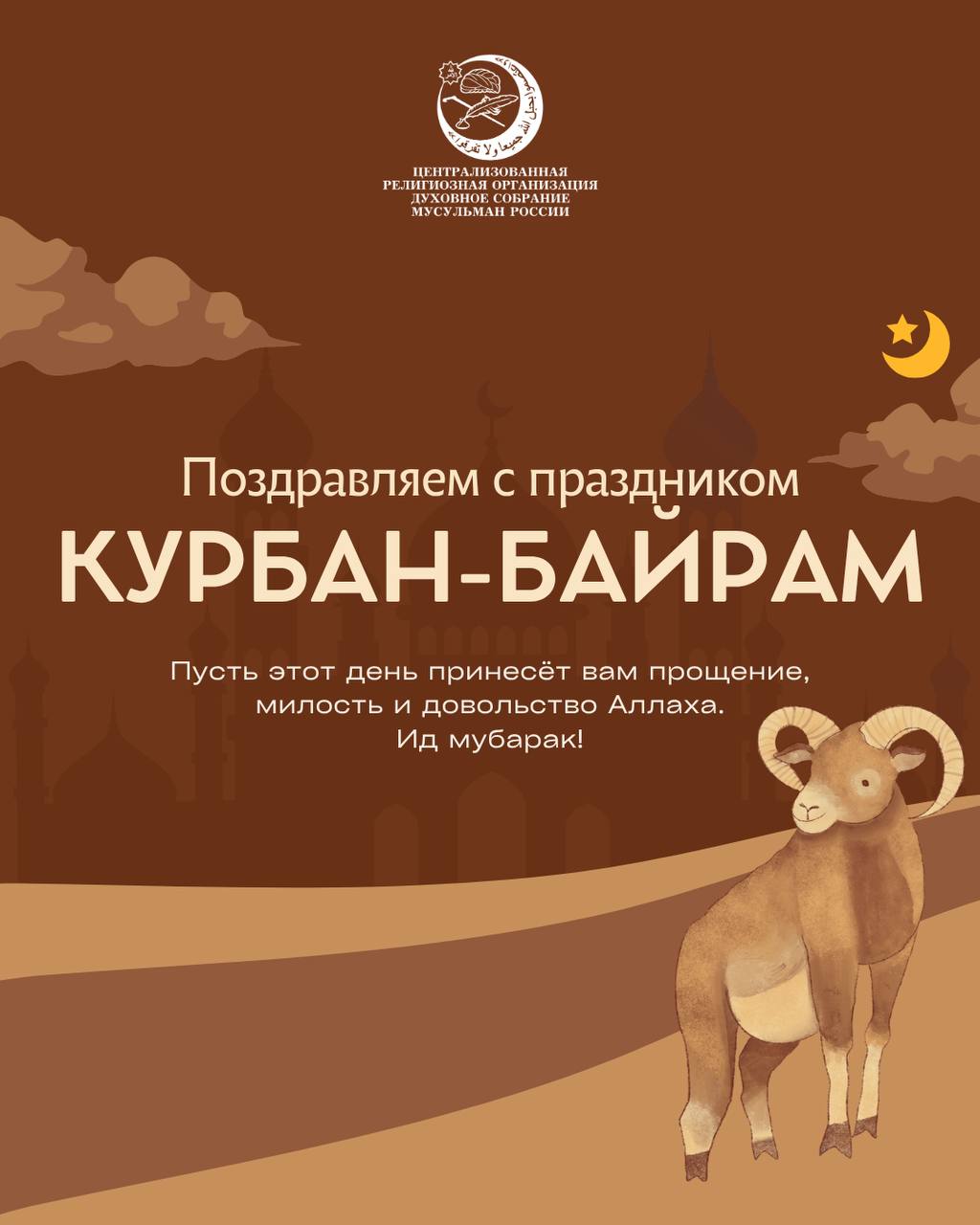 Уважаемые братья и сестры, дорогие соотечественники! Сердечно поздравляю Вас с наступающим благословенным праздником жертвоприношения Курбан-Байрам Ид-аль-Адха! От имени махалля- приходов Духовного собрания мусульман России и себя лично прошу Всевышнего Аллаха даровать Вам счастья, мира, спокойствия, успехов, благополучия и здоровья! В этот благословенный день по воле Всевышнего Аллаха мусульмане всего мира отмечают один из величайших праздников. Пусть Ваши сердца всегда наполняются нуром – светом истинной веры, а дома озаряются радостью и взаимопониманием.