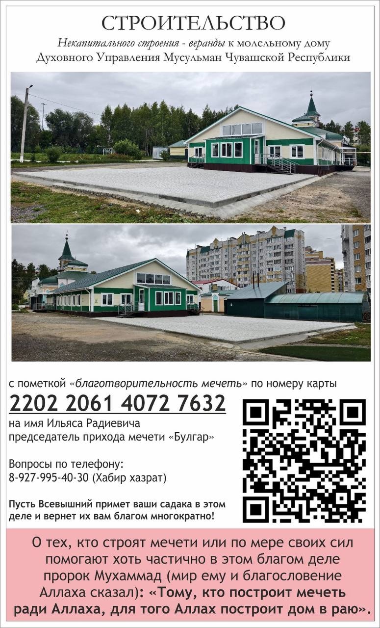 Дорогие единоверцы! В Чебоксарах, при мечети «Булгар», завершается строительство пристроя. Он необходим для того, чтобы больше наших братьев и сестёр могли молиться в достойных и комфортных условиях. Работы идут, но образовался долг перед строителями за материалы и оплату труда.