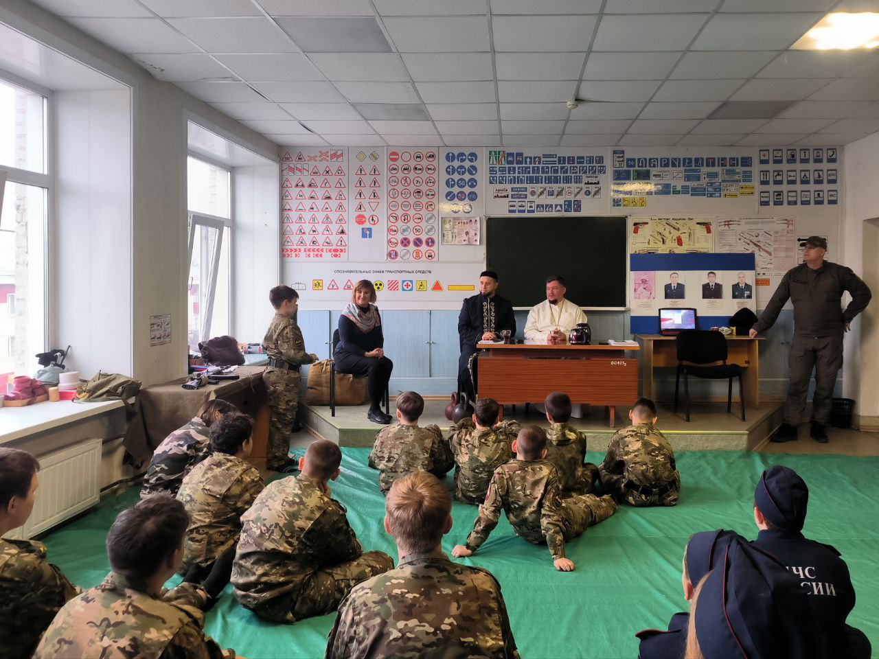В Центре специальной подготовки молодёжи города Ленинска-Кузнецкого состоялась встреча с юными патриотами. В мероприятии приняли участие заместитель муфтия по работе с молодежью, имам-хатыб мечети "Мухаррам" Дамир хазрат Мамин и священник отец Виталий.