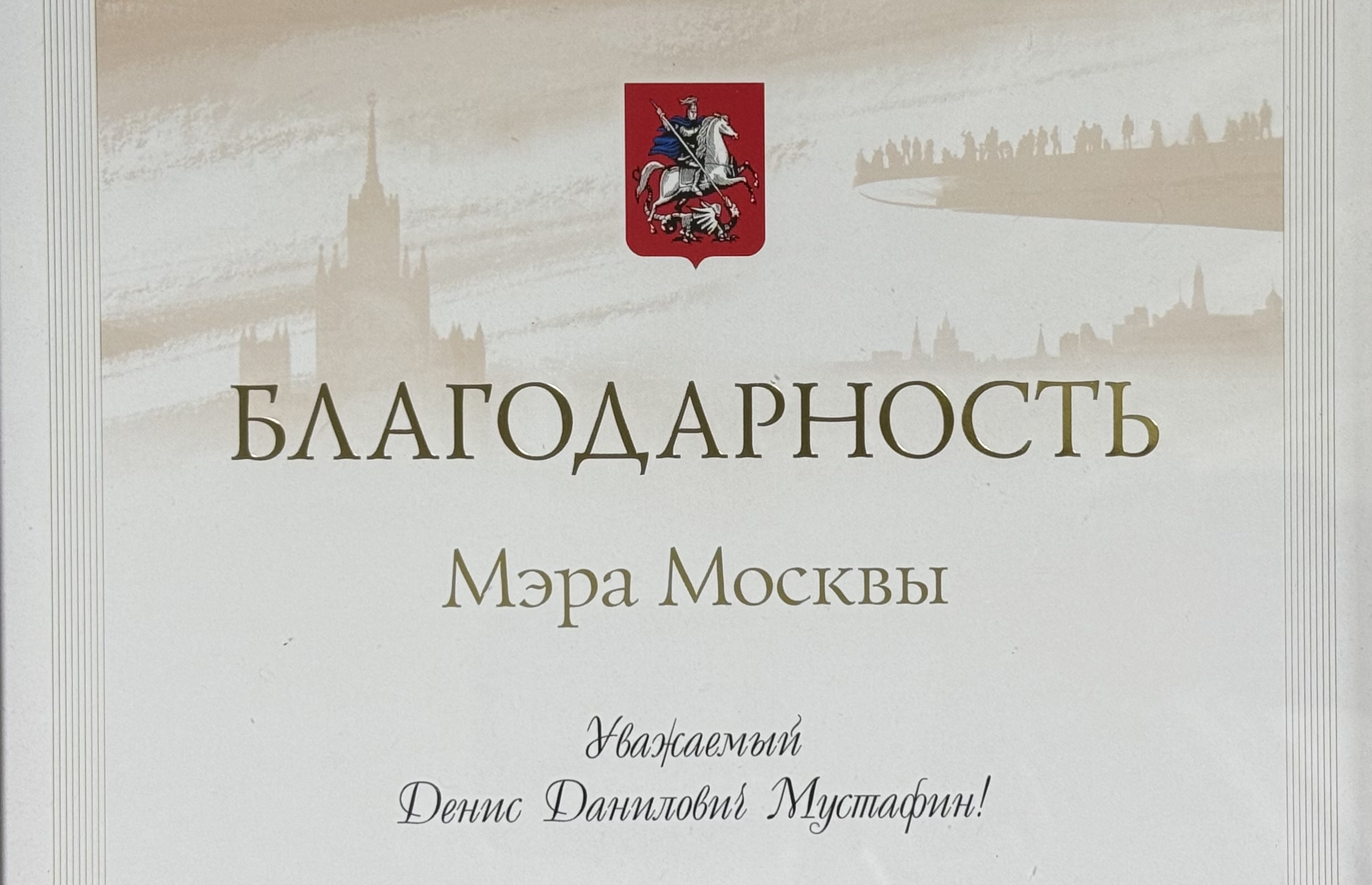 Заместителю главы Духовного собрания мусульман России, начальнику Управления делами Духовного Управления Мусульман города Москвы и Центрального региона "Московский Муфтият", имаму-хатыбу Денису- хазрату Мустафину вручена благодарность мэра Москвы Сергея Собянина за вклад в укрепление межконфессионального мира и согласия в обществе и многолетний добросовестный труд.