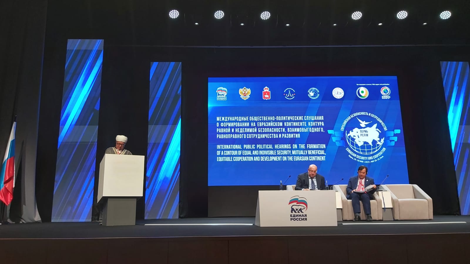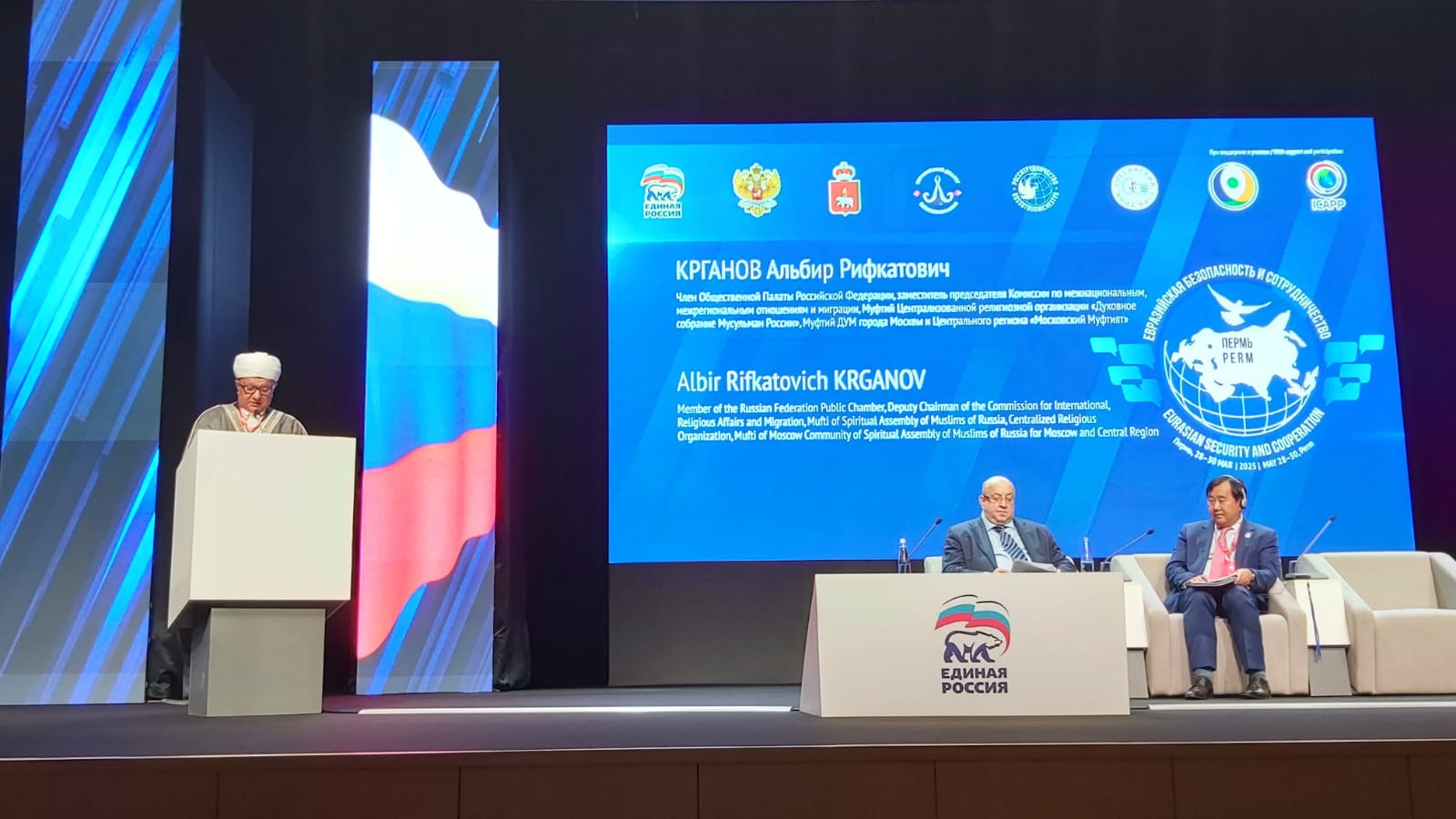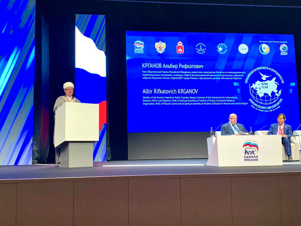 В работе пленарного заседании международных общественно-политических слушаний по проблемам формирования единой, равной системы безопасности и сотрудничества в Евразии, которые проходят в Перми, принял участие Глава Духовного собрания мусульман России, член Общественной палаты РФ, муфтий Москвы Альбир хазрат Крганов.